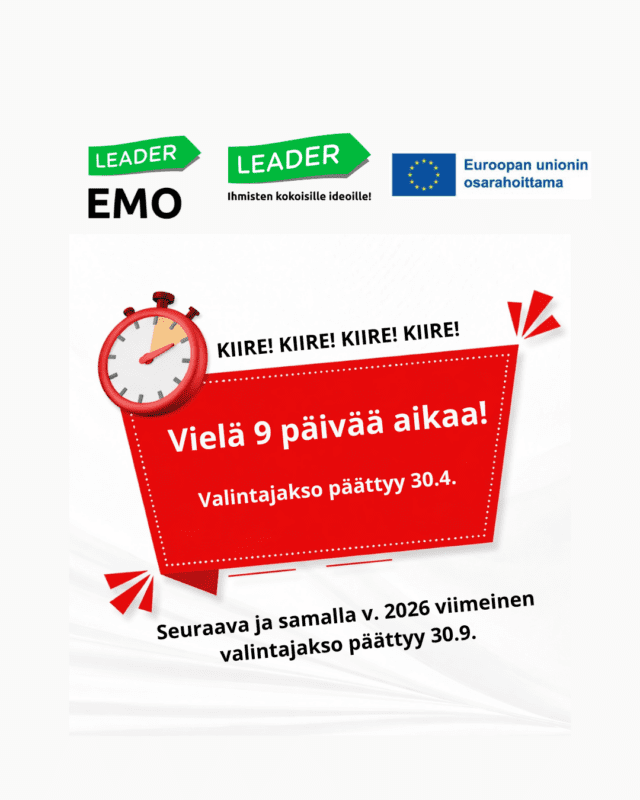 Jos suunnittelet Leader-rahoituksen hakemista, muistathan jättää hakemuksesi ajoissa. EMOn käynnissä oleva valintajakso päättyy 30.4.2026. Hakemuksia voi jättää kaikkiin hanketyyppeihin; mm. yleishyödyllisiin kehittämis- ja investointihankkeisiin, pienhankkeisiin sekä yrityshankkeisiin. Katso ohjeet EMOn kotisivuilla tai ole emo@emory.fi, puh. 050 573 2972. Myöhässä saapuneiden hakemusten käsittely siirtyy seuraavalle valintajaksolle.
